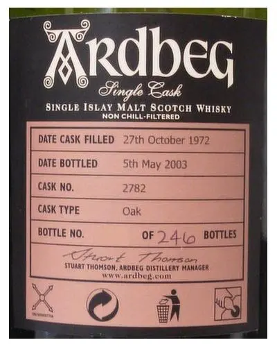 Distilled at Ardbeg distillery on 27th October 1972 and matured for more than three decades, this single cask Islay single malt has been bottled by the distillery exclusively for Italian spirits merchant VELIER. Bottled in May 2003 at a natural cask strength of 49.9% abv, just 246 individually numbered bottles have been produced.